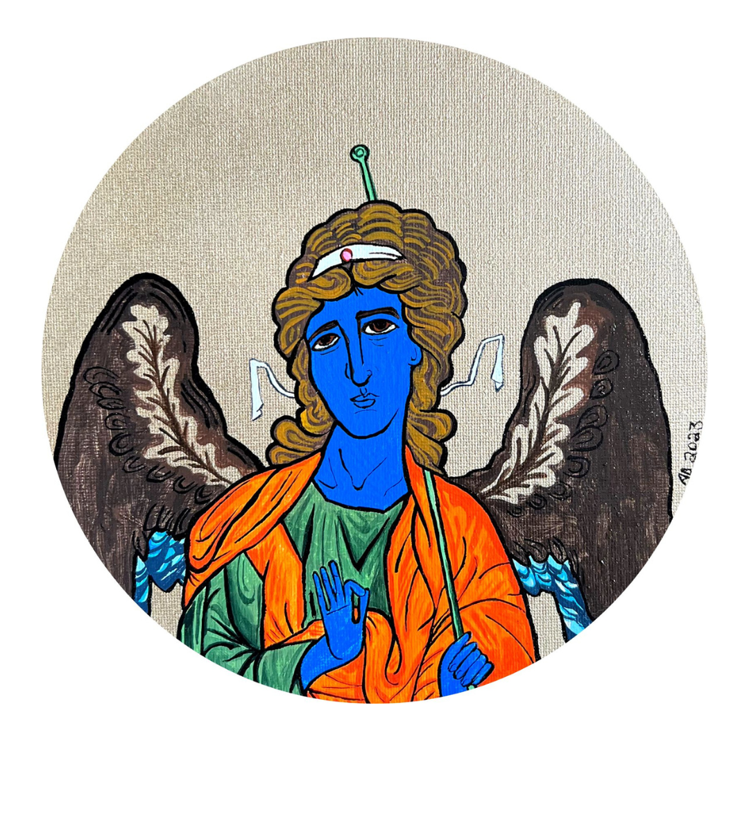 Fear not thy prayer is heard. This icon of the Archangel Gabriel is hand painted on a small 8 inch diameter canvas circle. Thought provoking with bold coloring it’s east meets west in this contemplative one of a kind work. You can own this gorgeous piece of art today.