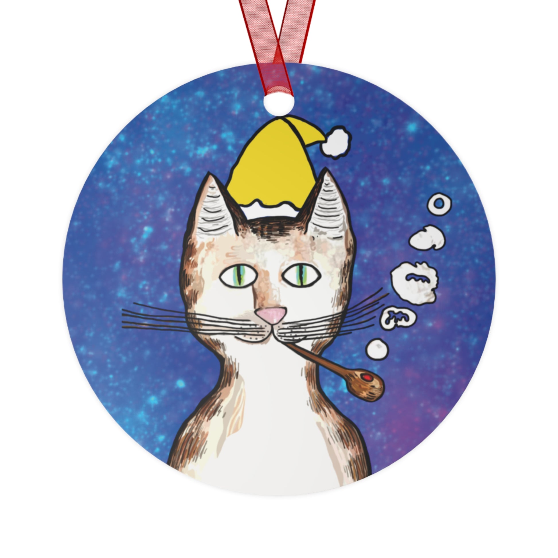 The Gentleman's Cat with Yellow Winter Hat Christmas Ornament. This quintessential Gentleman's Cat wearing a yellow winter hat appears boldly smoking his pipe in the foreground of a swirly sparkly winter blue background as he looks the viewer squarely on with a determined friendliness. He's cute and confident to be sure.