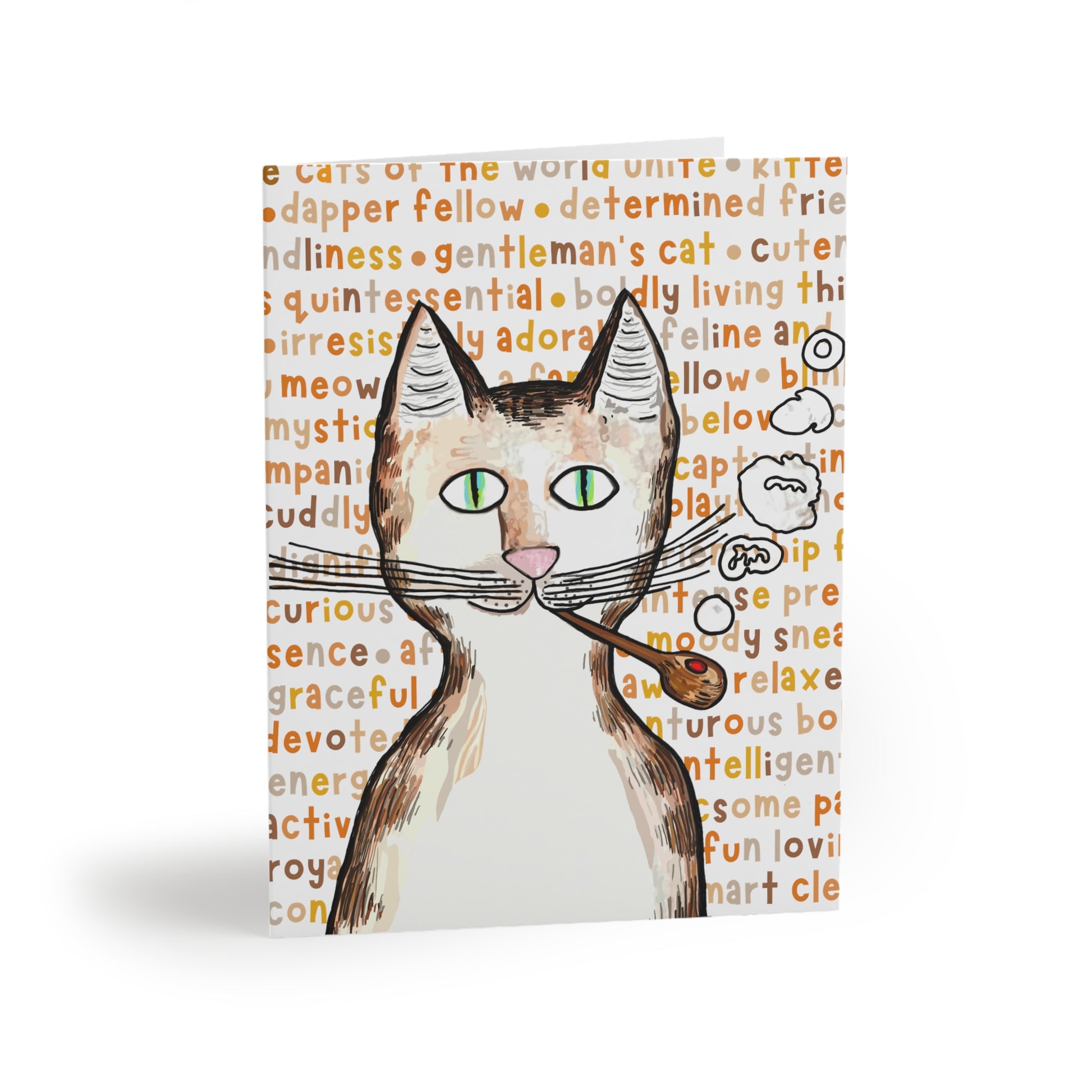 This quintessential Gentleman's Cat appears boldly smoking his pipe as he looks the viewer squarely on with a determined friendliness. He's cute and he's confident and he will make your day.