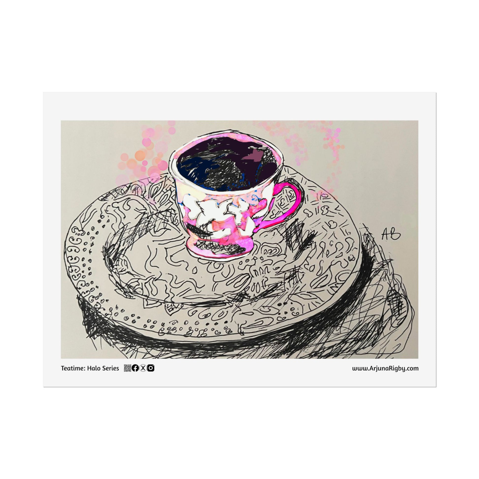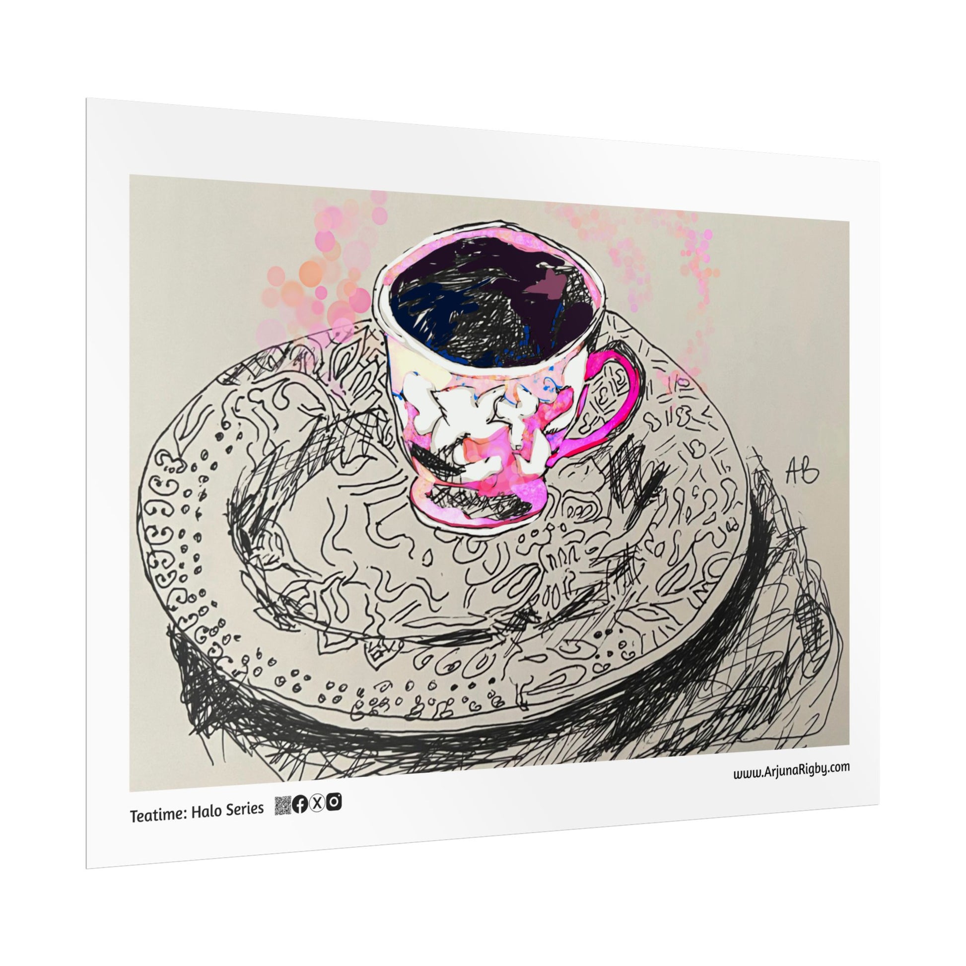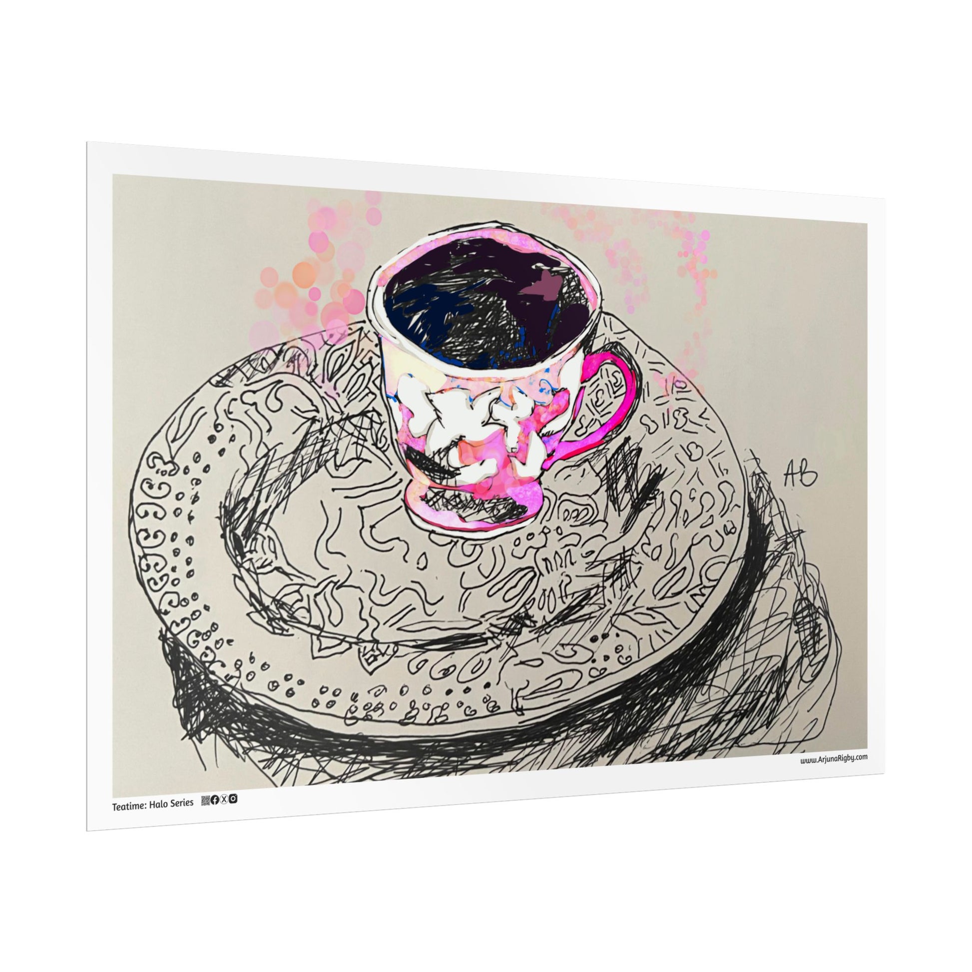 The Teatime Framed Fine Art Print has a traditional pen sketch patterning saucer and teacup combined with modern upgrade of glowing halo and energy creating a sacred observance of the objecthood itself. Each rolled print is made with semi-glossy art paper and comes in three sizes.