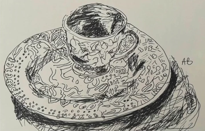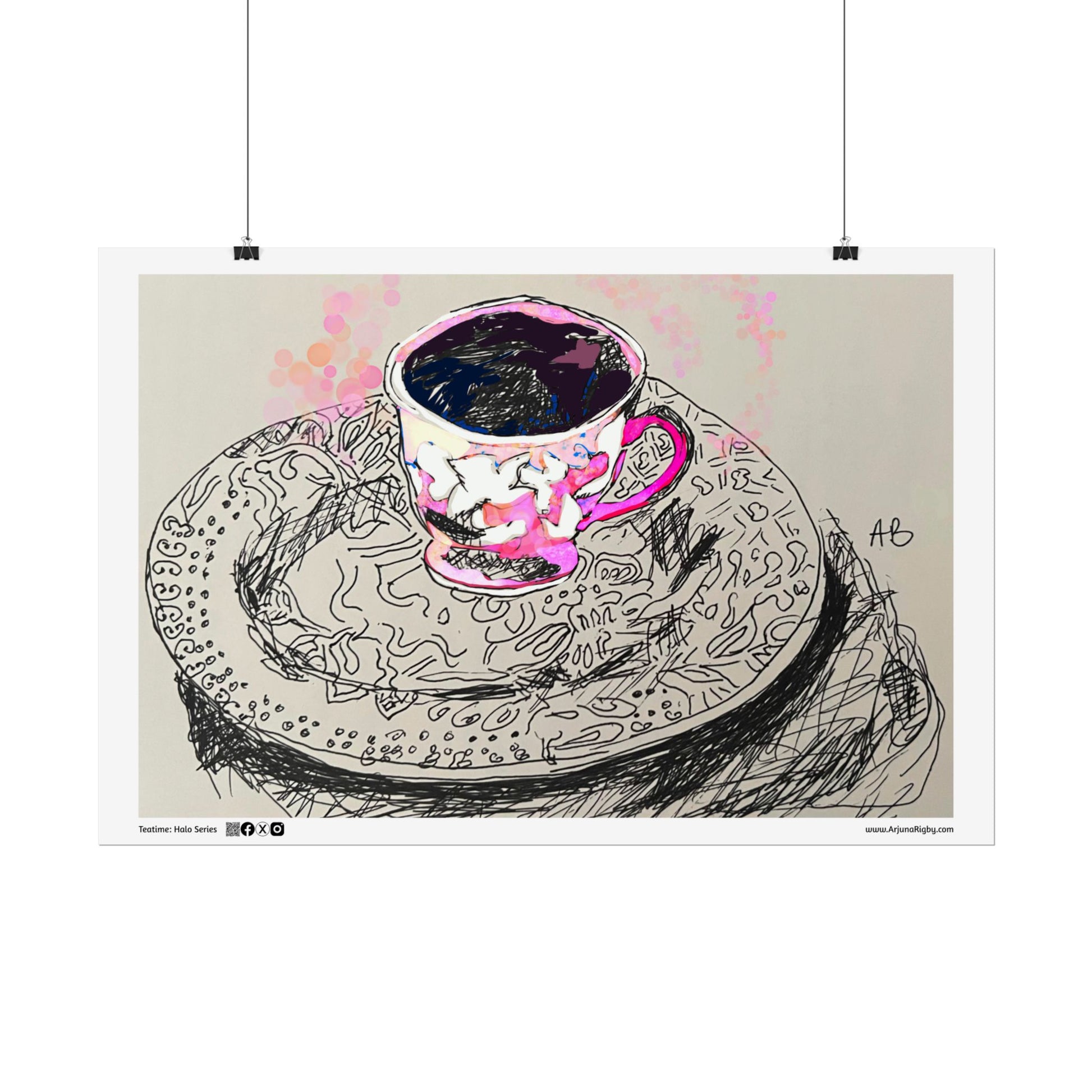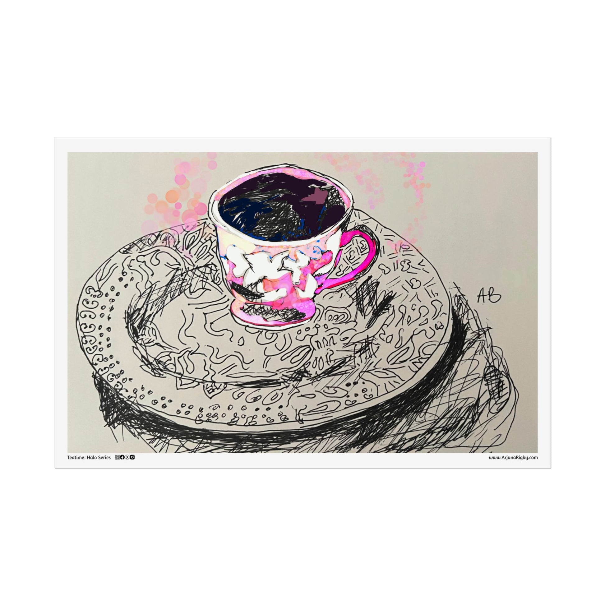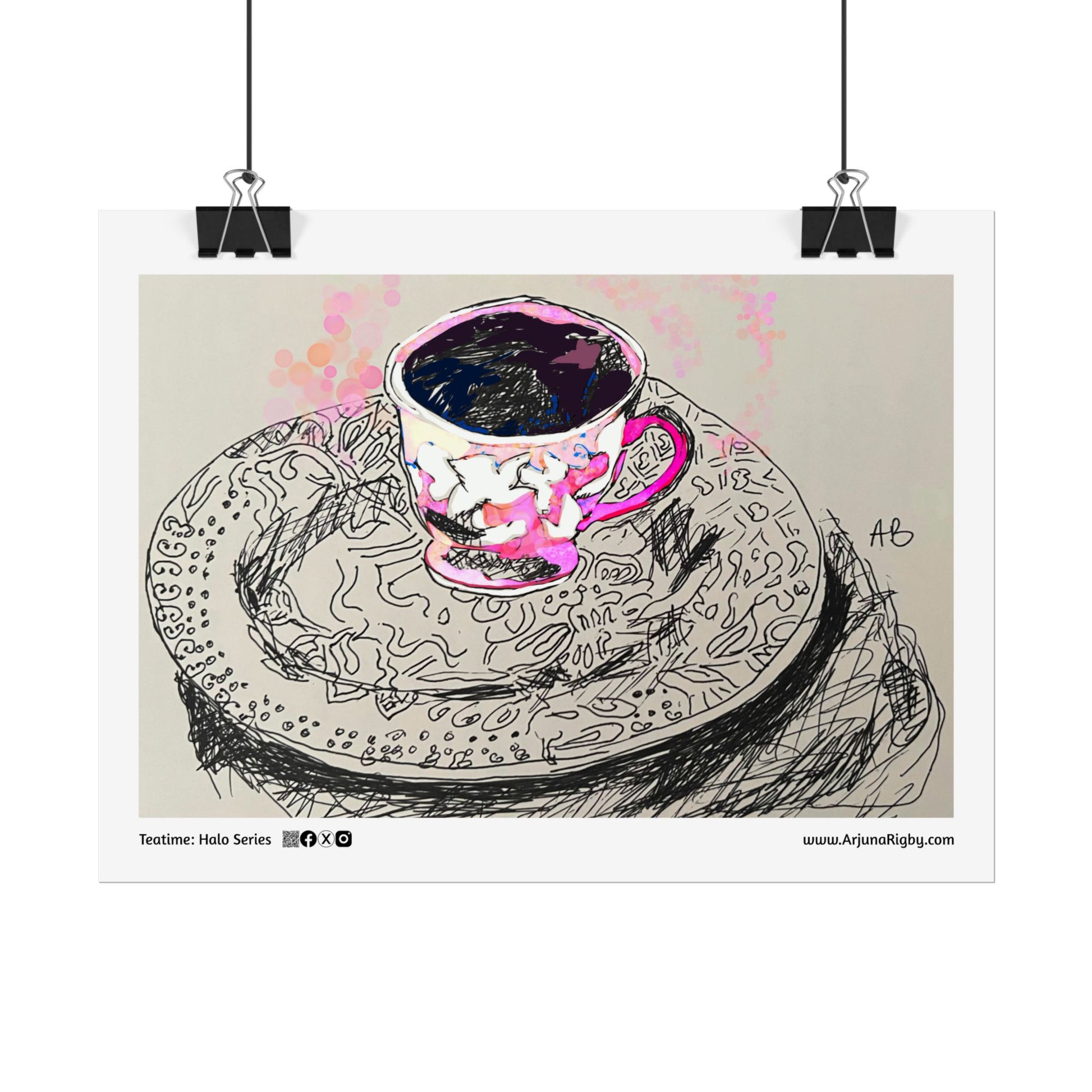 The Teatime Framed Fine Art Print has a traditional pen sketch patterning saucer and teacup combined with modern upgrade of glowing halo and energy creating a sacred observance of the objecthood itself. Each rolled print is made with semi-glossy art paper and comes in three sizes.